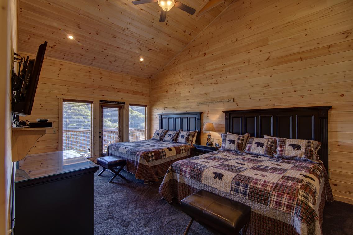 You will enter A View To Remember on the main level. This middle level of the cabin features a bright and open common space with the dining table, kitchen, and living room. The dining table seats 6, with additional seating for 3 at the bar. The kitchen is fully equipped with a side by side refrigerator (with icemaker), a glass top stove, an oven, and a dishwasher. The fully stocked kitchen come complete with a coffee pot, a blender, a toaster, and standard cooking and eating utensils to accommodate 12 guests.