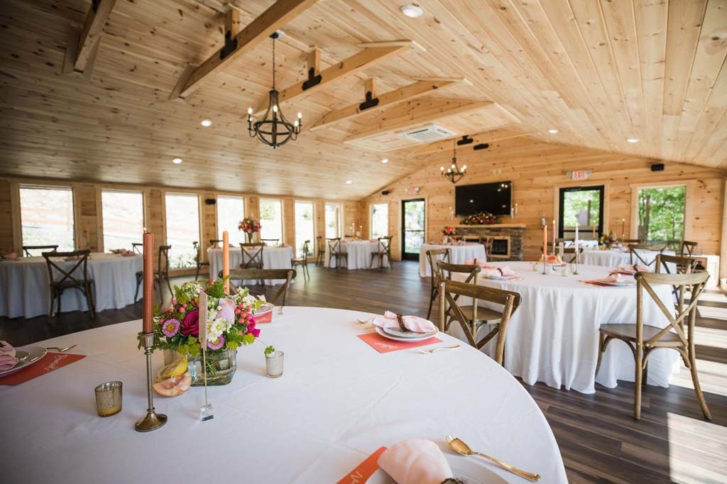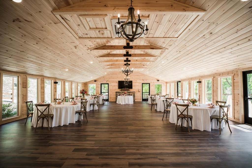 Dinner is then served in the elegantly designed indoor reception hall, which comfortably accommodates your entire party. Featuring hardwood floors, warm wood accents, a cozy fireplace, air conditioning, private restrooms, and a flat-screen TV for slideshows and videos, this space has everything you need for a seamless and memorable reception.