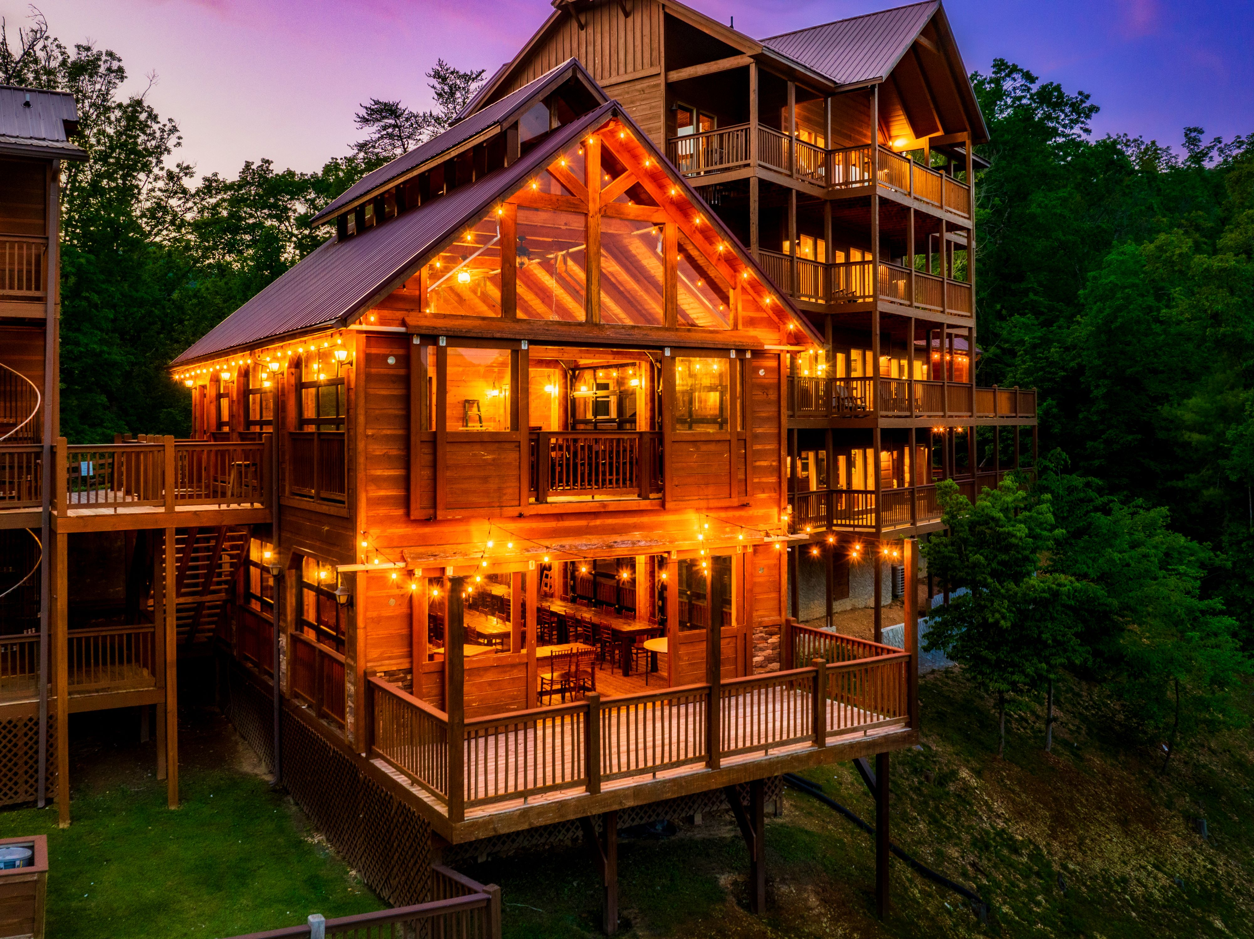 Smoky Mountain Lodge is a 12-bedroom, 11-bathroom cabin that sleeps up to 50 guests. Eight bedrooms feature king-size beds with private en-suite bathrooms, while two upstairs bunk rooms share a bathroom—ideal for children. There are two additional bunk bedrooms downstairs with their own en-suite bathrooms. The cabin also includes a game room, private movie theater, hot tub, outdoor TV, outdoor fireplace, and a backyard complete with a fire pit and grill. The backyard conveniently connects to the Pavilion, offering additional space for your celebration.